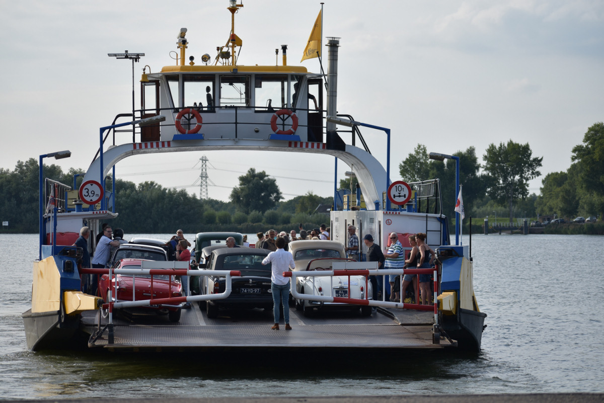 Het hele spul moest natuurlijk weer terug naar Dordrecht. Met een brede rivier als obstakel - hoeveel 'riverside' wil je? - moest dat via de veerpont. Alleen, de oorspronkelijke was nog steeds uit de vaart, dus moesten alle auto's heel geduldig wachten op de kleine pont. Ook toen vermaakten de deelnemers zich door bij elkaar te buurten, terwijl het op Google Maps een ingetekende file aan Werkendamse kant opleverde!